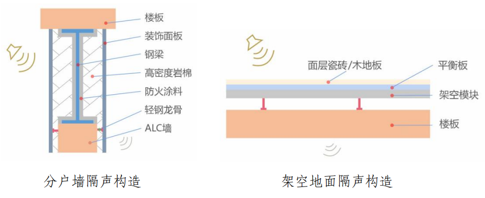 项目团队通过采用架空地面和架空墙面设计,将室内装饰地面与结构楼板及墙体分离,可阻断地面撞击声上下层传递路径。经过测试,采用架空地面和架空墙面的设计的楼板撞击隔声达到 70dB,实现了上下楼层干扰少。
