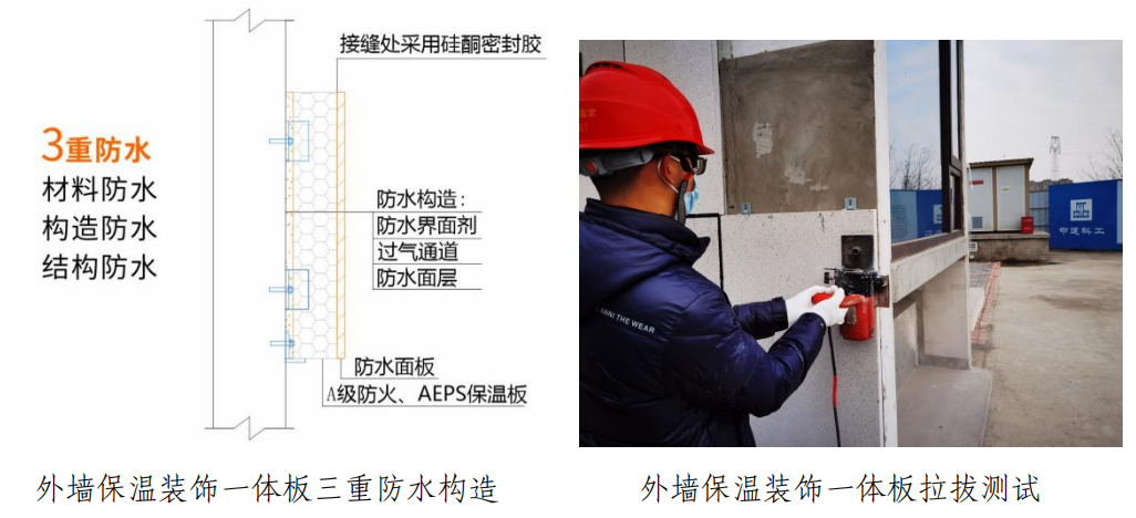 保温装饰一体板与 ALC 基墙采用粘锚连接固定。相比传统薄抹灰保温工艺,保温装饰一体板具有更好的防水、防裂和防脱落性能。其 AEPS 保温层具有不燃、憎水、自重轻的特点。经现场拉拔测试,保温装饰一体板粘贴垂直拉伸强度≥0.10Mpa,与墙面粘接牢靠。